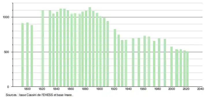 L'évolution du nombre d'habitants est connue à travers les recensements de la population effectués dans la commune depuis 1793. Pour les communes de moins de 10 000 habitants, une enquête de recensement portant sur toute la population est réalisée tous les cinq ans, les populations légales des années intermédiaires étant quant à elles estimées par interpolation ou extrapolation[18]. Pour la commune, le premier recensement exhaustif entrant dans le cadre du nouveau dispositif a été réalisé en 2007[19].