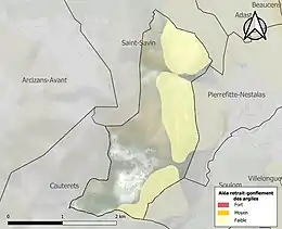 Le retrait-gonflement des sols argileux est susceptible d'engendrer des dommages importants aux bâtiments en cas d’alternance de périodes de sécheresse et de pluie. La totalité de la commune est en aléa faible (44,5 % au niveau départemental et 48,5 % au niveau national). Sur les 27 bâtiments dénombrés sur la commune en 2019, aucun n'est en aléa moyen ou fort, à comparer aux 75 % au niveau départemental et 54 % au niveau national. Une cartographie de l'exposition du territoire national au retrait gonflement des sols argileux est disponible sur le site du BRGM[37],[Carte 3].