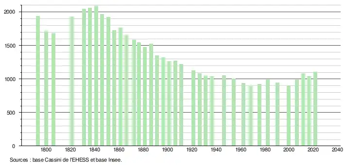 L'évolution du nombre d'habitants est connue à travers les recensements de la population effectués dans la commune depuis 1793. Pour les communes de moins de 10 000 habitants, une enquête de recensement portant sur toute la population est réalisée tous les cinq ans, les populations légales des années intermédiaires étant quant à elles estimées par interpolation ou extrapolation[28]. Pour la commune, le premier recensement exhaustif entrant dans le cadre du nouveau dispositif a été réalisé en 2006[29].