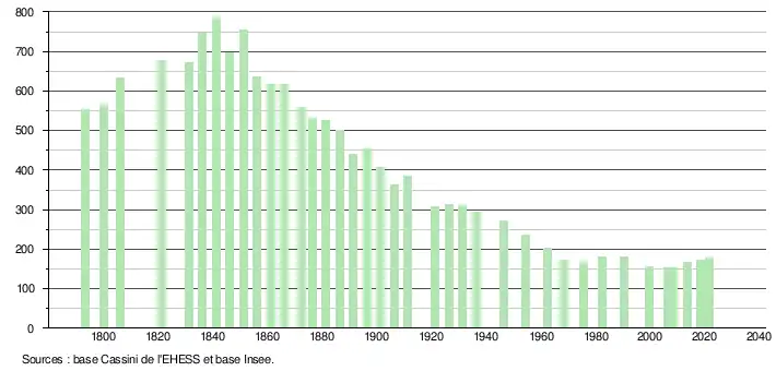 L'évolution du nombre d'habitants est connue à travers les recensements de la population effectués dans la commune depuis 1793. Pour les communes de moins de 10 000 habitants, une enquête de recensement portant sur toute la population est réalisée tous les cinq ans, les populations légales des années intermédiaires étant quant à elles estimées par interpolation ou extrapolation[18]. Pour la commune, le premier recensement exhaustif entrant dans le cadre du nouveau dispositif a été réalisé en 2008[19].