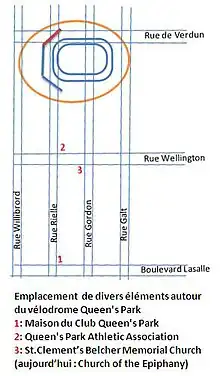 Une gravure publiée dans La Presse du 5 août 1899 (page 1) vient également confirmer la localisation du vélodrome telle que décrite dans La Patrie du 16 février 1898 (page 3)[7]. Cette illustration montre une vue vers le sud : on y aperçoit des bâtiments sur la rue Wellington