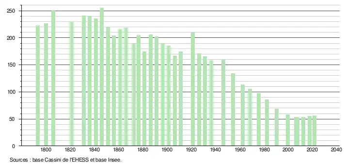 L'évolution du nombre d'habitants est connue à travers les recensements de la population effectués dans la commune depuis 1793. Pour les communes de moins de 10 000 habitants, une enquête de recensement portant sur toute la population est réalisée tous les cinq ans, les populations légales des années intermédiaires étant quant à elles estimées par interpolation ou extrapolation[14]. Pour la commune, le premier recensement exhaustif entrant dans le cadre du nouveau dispositif a été réalisé en 2007[15].