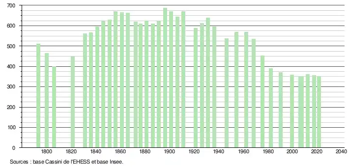 L'évolution du nombre d'habitants est connue à travers les recensements de la population effectués dans la commune depuis 1793. Pour les communes de moins de 10 000 habitants, une enquête de recensement portant sur toute la population est réalisée tous les cinq ans, les populations légales des années intermédiaires étant quant à elles estimées par interpolation ou extrapolation[27]. Pour la commune, le premier recensement exhaustif entrant dans le cadre du nouveau dispositif a été réalisé en 2007[28].
