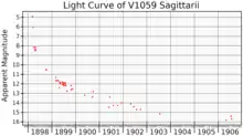 Courbe de lumière de V1059 Sagittarii, réalisée à partir des relevés en magnitude photographique de Walker et Shapley[8]. La valeur des points listés à des dates identiques a été moyennée avant traçage.
