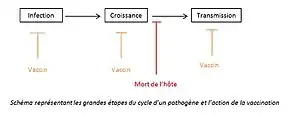 Les vaccins peuvent agir sur les différentes étapes du cycle de vie du pathogène[1] (Figure 3). Cependant, si le vaccin est focalisé sur une étape du cycle, le pathogène va tenter de contourner cet obstacle en optimisant une autre étape du cycle[1],[12].