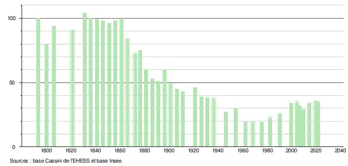 L'évolution du nombre d'habitants est connue à travers les recensements de la population effectués dans la commune depuis 1793. Pour les communes de moins de 10 000 habitants, une enquête de recensement portant sur toute la population est réalisée tous les cinq ans, les populations légales des années intermédiaires étant quant à elles estimées par interpolation ou extrapolation[16]. Pour la commune, le premier recensement exhaustif entrant dans le cadre du nouveau dispositif a été réalisé en 2004[17].