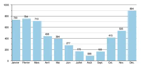 Les crues, quant à elles, peuvent être très importantes, compte tenu bien sûr de l'exiguïté du bassin versant. Les QIX 2 et QIX 5 valent respectivement 15 et 20 m3/s. Le QIX 10 est de 24 m3/s, le QIX 20 de 27 m3/s, tandis que le QIX 50 se monte à 31 m3/s.
