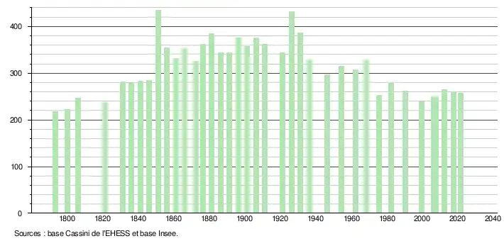 L'évolution du nombre d'habitants est connue à travers les recensements de la population effectués dans la commune depuis 1793. Pour les communes de moins de 10 000 habitants, une enquête de recensement portant sur toute la population est réalisée tous les cinq ans, les populations légales des années intermédiaires étant quant à elles estimées par interpolation ou extrapolation[14]. Pour la commune, le premier recensement exhaustif entrant dans le cadre du nouveau dispositif a été réalisé en 2007[15].