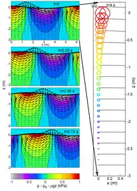 - Un terme de dérive proportionnel au carré de l'amplitude déforme les trajectoires elliptiques du premier ordre pour donner naissance à des trajectoires qui ressemblent vaguement à des cycloïdes allongées. Une méthode élégante ([9]) permet de déterminer cette dérive en corrigeant le champ de vitesses d'Euler par un calcul dans les coordonnées de Lagrange. Néanmoins, la cohérence du développement limité exige que cette correction soit considérée comme un terme du deuxième ordre négligeable au premier ordre (pour une description élémentaire du mécanisme général de dérive, voir Dérive d'un navire amarré).