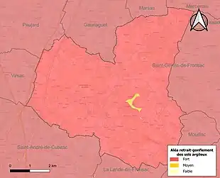 Le retrait-gonflement des sols argileux est susceptible d'engendrer des dommages importants aux bâtiments en cas d’alternance de périodes de sécheresse et de pluie. La totalité de la commune est en aléa moyen ou fort (67,4 % au niveau départemental et 48,5 % au niveau national). Sur les 1 389 bâtiments dénombrés sur la commune en 2019, 1 389 sont en aléa moyen ou fort, soit 100 %, à comparer aux 84 % au niveau départemental et 54 % au niveau national. Une cartographie de l'exposition du territoire national au retrait gonflement des sols argileux est disponible sur le site du BRGM[22],[23].