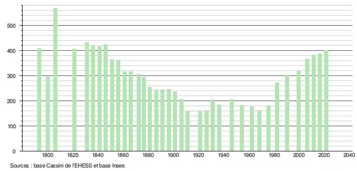 | L'évolution du nombre d'habitants est connue à travers les recensements de la population effectués dans la commune depuis 1793. Pour les communes de moins de 10 000 habitants, une enquête de recensement portant sur toute la population est réalisée tous les cinq ans, les populations légales des années intermédiaires étant quant à elles estimées par interpolation ou extrapolation[25]. Pour la commune, le premier recensement exhaustif entrant dans le cadre du nouveau dispositif a été réalisé en 2006[26]. En 2021, la commune comptait 401 habitants[Note 3], en augmentation de 2,56 % par rapport à 2015 (Eure : −0,5 %, France hors Mayotte : +1,84 %). |