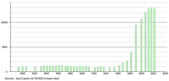 - Par convention dans Wikipédia, le principe a été retenu de n’afficher dans le tableau des recensements et le graphique, pour les populations légales postérieures à 1999, que les populations correspondant à une enquête exhaustive de recensement pour les communes de moins de 10 000 habitants, et que les populations des années 2006, 2011, 2016, etc. pour les communes de plus de 10 000 habitants, ainsi que la dernière population légale publiée par l’Insee pour l'ensemble des communes.