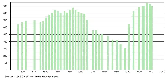 L'évolution du nombre d'habitants est connue à travers les recensements de la population effectués dans la commune depuis 1793. Pour les communes de moins de 10 000 habitants, une enquête de recensement portant sur toute la population est réalisée tous les cinq ans, les populations légales des années intermédiaires étant quant à elles estimées par interpolation ou extrapolation[22]. Pour la commune, le premier recensement exhaustif entrant dans le cadre du nouveau dispositif a été réalisé en 2008[23].