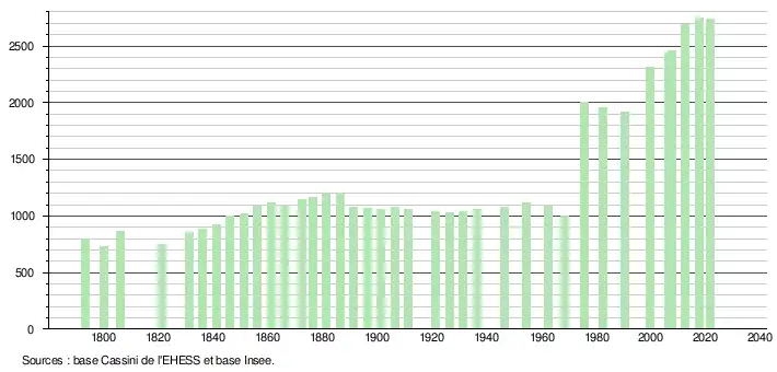 L'évolution du nombre d'habitants est connue à travers les recensements de la population effectués dans la commune depuis 1793. Pour les communes de moins de 10 000 habitants, une enquête de recensement portant sur toute la population est réalisée tous les cinq ans, les populations légales des années intermédiaires étant quant à elles estimées par interpolation ou extrapolation[22]. Pour la commune, le premier recensement exhaustif entrant dans le cadre du nouveau dispositif a été réalisé en 2007[23].