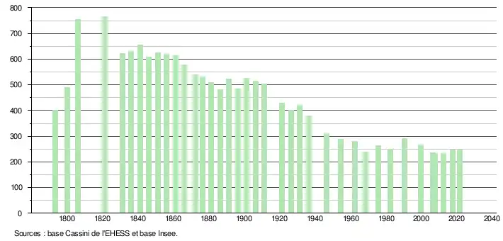Le nombre d'exploitations agricoles en activité et ayant leur siège dans la commune est passé de 30 lors du recensement agricole de 1988[Note 14] à 19 en 2000 puis à 11 en 2010[36] et enfin à 11 en 2020[Carte 6], soit une baisse de 63 % en 32 ans. Le même mouvement est observé à l'échelle du département qui a perdu pendant cette période 57 % de ses exploitations[37],[Carte 7]. La surface agricole utilisée sur la commune a quant à elle augmenté, passant de 958 ha en 1988 à 1 164 ha en 2020[Carte 8]. Parallèlement la surface agricole utilisée moyenne par exploitation a augmenté, passant de 32 à 106 ha[36].
