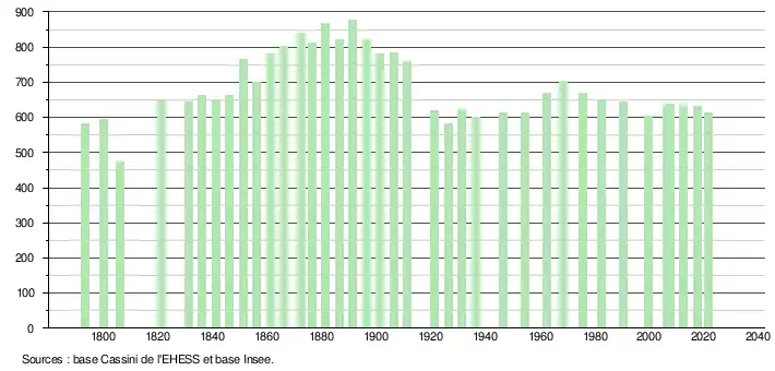 L'évolution du nombre d'habitants est connue à travers les recensements de la population effectués dans la commune depuis 1793. Pour les communes de moins de 10 000 habitants, une enquête de recensement portant sur toute la population est réalisée tous les cinq ans, les populations légales des années intermédiaires étant quant à elles estimées par interpolation ou extrapolation[20]. Pour la commune, le premier recensement exhaustif entrant dans le cadre du nouveau dispositif a été réalisé en 2007[21].
