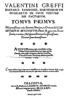 - Valentini Greffi Bacfarci pannonii, harmoniarum musicarum in usum testudinis factarum, tomus primus. Cracovie : Lazarus Andrea, 1565. RISM 156522 = B 724.