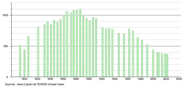 L'évolution du nombre d'habitants est connue à travers les recensements de la population effectués dans la commune depuis 1793. Pour les communes de moins de 10 000 habitants, une enquête de recensement portant sur toute la population est réalisée tous les cinq ans, les populations légales des années intermédiaires étant quant à elles estimées par interpolation ou extrapolation[21]. Pour la commune, le premier recensement exhaustif entrant dans le cadre du nouveau dispositif a été réalisé en 2008[22].