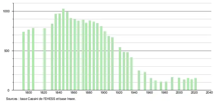 L'évolution du nombre d'habitants est connue à travers les recensements de la population effectués dans la commune depuis 1793. Pour les communes de moins de 10 000 habitants, une enquête de recensement portant sur toute la population est réalisée tous les cinq ans, les populations légales des années intermédiaires étant quant à elles estimées par interpolation ou extrapolation[14]. Pour la commune, le premier recensement exhaustif entrant dans le cadre du nouveau dispositif a été réalisé en 2006[15].