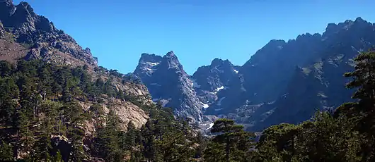 - Expèces végétales : pin laricio (large en langue corse), aulne odorant (bassu), buis (bussu), genêt épineux (ghjinestra), sorbier (sorbu), genévrier oxycèdre (ghjinèparu).