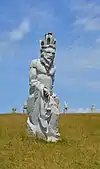 | 28 | Gwenn | 2013 | Patrice Le Guen | Statue de 4 m et 12 t en granit jaune aurore de Bignan (granit beige à grains fins et moyens de couleur jaune et gris-jaune). Les trois seins (motif de la polymastie) et les triplés sont ses attributs iconographiques. Selon la légende, Dieu lui aurait accordé un troisième sein pour pouvoir allaiter ses triplés (Guethenoc, Jacut et Guénolé), d'où son surnom breton « santez Gwenn Teir Bronn », littéralement « sainte Gwenn aux trois seins »[68]. Clin d'œil du sculpteur, il fait apparaître des rondeurs qui suggèrent qu'elle est enceinte de son quatrième enfant, Clervie[69]. Protectrice des enfants, elle est invoquée par les mères manquant de lait et est la patronne des nourrices. | ![]() |