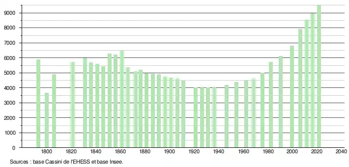 L'évolution du nombre d'habitants est connue à travers les recensements de la population effectués dans la commune depuis 1793. Pour les communes de moins de 10 000 habitants, une enquête de recensement portant sur toute la population est réalisée tous les cinq ans, les populations légales des années intermédiaires étant quant à elles estimées par interpolation ou extrapolation[18]. Pour la commune, le premier recensement exhaustif entrant dans le cadre du nouveau dispositif a été réalisé en 2006[19].