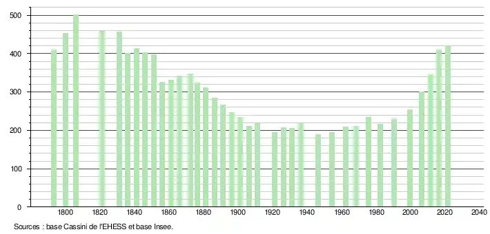 | L'évolution du nombre d'habitants est connue à travers les recensements de la population effectués dans la commune depuis 1793. Pour les communes de moins de 10 000 habitants, une enquête de recensement portant sur toute la population est réalisée tous les cinq ans, les populations légales des années intermédiaires étant quant à elles estimées par interpolation ou extrapolation[23]. Pour la commune, le premier recensement exhaustif entrant dans le cadre du nouveau dispositif a été réalisé en 2006[24]. En 2021, la commune comptait 421 habitants[Note 3], en augmentation de 7,67 % par rapport à 2015 (Eure : −0,5 %, France hors Mayotte : +1,84 %). |