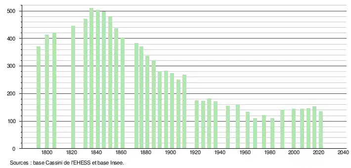 L'évolution du nombre d'habitants est connue à travers les recensements de la population effectués dans la commune depuis 1793. Pour les communes de moins de 10 000 habitants, une enquête de recensement portant sur toute la population est réalisée tous les cinq ans, les populations légales des années intermédiaires étant quant à elles estimées par interpolation ou extrapolation[22]. Pour la commune, le premier recensement exhaustif entrant dans le cadre du nouveau dispositif a été réalisé en 2006[23].