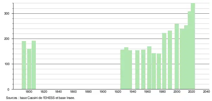 L'évolution du nombre d'habitants est connue à travers les recensements de la population effectués dans la commune depuis 1793. Pour les communes de moins de 10 000 habitants, une enquête de recensement portant sur toute la population est réalisée tous les cinq ans, les populations légales des années intermédiaires étant quant à elles estimées par interpolation ou extrapolation[15]. Pour la commune, le premier recensement exhaustif entrant dans le cadre du nouveau dispositif a été réalisé en 2007[16].