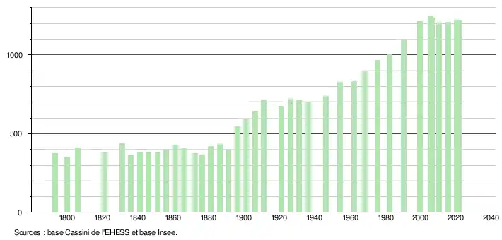 L'évolution du nombre d'habitants est connue à travers les recensements de la population effectués dans la commune depuis 1793. Pour les communes de moins de 10 000 habitants, une enquête de recensement portant sur toute la population est réalisée tous les cinq ans, les populations légales des années intermédiaires étant quant à elles estimées par interpolation ou extrapolation[41]. Pour la commune, le premier recensement exhaustif entrant dans le cadre du nouveau dispositif a été réalisé en 2005[42].