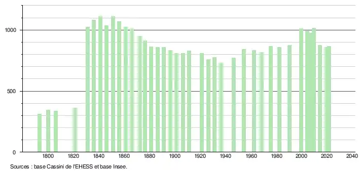 L'évolution du nombre d'habitants est connue à travers les recensements de la population effectués dans la commune depuis 1793. Pour les communes de moins de 10 000 habitants, une enquête de recensement portant sur toute la population est réalisée tous les cinq ans, les populations légales des années intermédiaires étant quant à elles estimées par interpolation ou extrapolation[24]. Pour la commune, le premier recensement exhaustif entrant dans le cadre du nouveau dispositif a été réalisé en 2004[25].