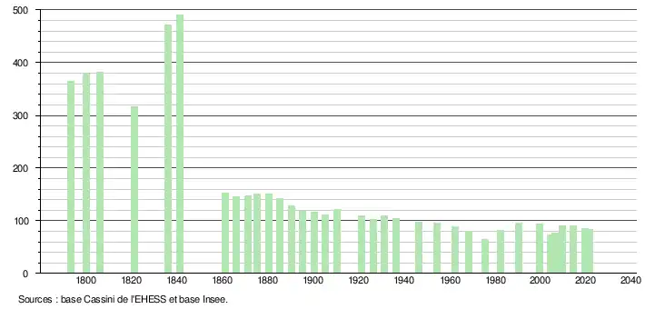 L'évolution du nombre d'habitants est connue à travers les recensements de la population effectués dans la commune depuis 1793. Pour les communes de moins de 10000habitants, une enquête de recensement portant sur toute la population est réalisée tous les cinqans, les populations légales des années intermédiaires étant quant à elles estimées par interpolation ou extrapolation[16]. Pour la commune, le premier recensement exhaustif entrant dans le cadre du nouveau dispositif a été réalisé en 2004[17].