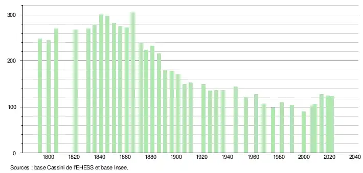 L'évolution du nombre d'habitants est connue à travers les recensements de la population effectués dans la commune depuis 1793. Pour les communes de moins de 10 000 habitants, une enquête de recensement portant sur toute la population est réalisée tous les cinq ans, les populations légales des années intermédiaires étant quant à elles estimées par interpolation ou extrapolation[17]. Pour la commune, le premier recensement exhaustif entrant dans le cadre du nouveau dispositif a été réalisé en 2008[18].