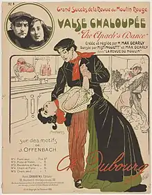 La danse représente une dispute de couple, souvent entre un voyou Apache et une prostituée. L'homme donne l'impression de frapper et de battre la femme, parfois jusqu'à la rendre inconsciente et parfois la femme se bat en retour. La danse est violente, sportive et spectaculaire[10]. Finalement, le couple effectue une valse rythmée[2],[alpha 1]. Contrairement aux apparences, la danse a été créée par une femme comme assertion d'indépendance et d'autonomisation des femmes[3],[5].