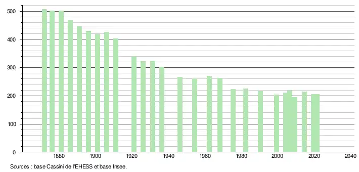 L'évolution du nombre d'habitants est connue à travers les recensements de la population effectués dans la commune depuis 1872. Pour les communes de moins de 10 000 habitants, une enquête de recensement portant sur toute la population est réalisée tous les cinq ans, les populations légales des années intermédiaires étant quant à elles estimées par interpolation ou extrapolation[40]. Pour la commune, le premier recensement exhaustif entrant dans le cadre du nouveau dispositif a été réalisé en 2004[41].