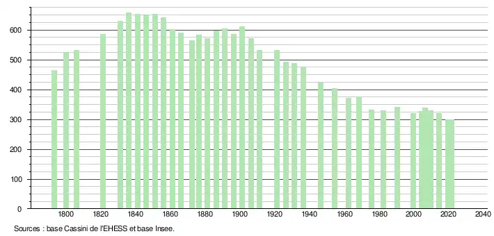 L'évolution du nombre d'habitants est connue à travers les recensements de la population effectués dans la commune depuis 1793. Pour les communes de moins de 10 000 habitants, une enquête de recensement portant sur toute la population est réalisée tous les cinq ans, les populations légales des années intermédiaires étant quant à elles estimées par interpolation ou extrapolation[23]. Pour la commune, le premier recensement exhaustif entrant dans le cadre du nouveau dispositif a été réalisé en 2004[24].