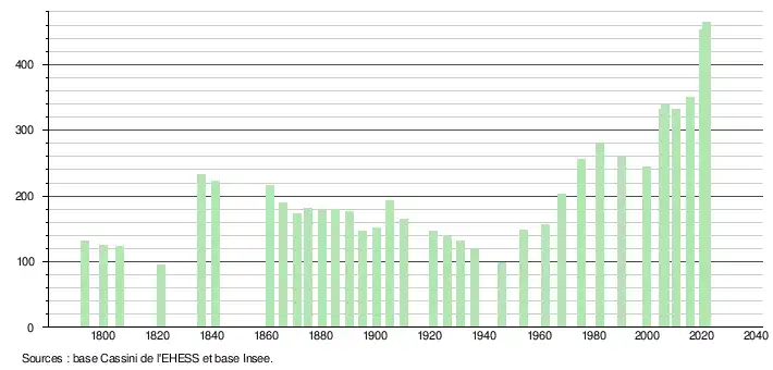 L'évolution du nombre d'habitants est connue à travers les recensements de la population effectués dans la commune depuis 1793. Pour les communes de moins de 10 000 habitants, une enquête de recensement portant sur toute la population est réalisée tous les cinq ans, les populations légales des années intermédiaires étant quant à elles estimées par interpolation ou extrapolation[14]. Pour la commune, le premier recensement exhaustif entrant dans le cadre du nouveau dispositif a été réalisé en 2005[15].