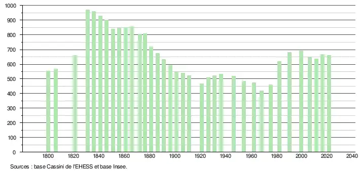 L'évolution du nombre d'habitants est connue à travers les recensements de la population effectués dans la commune depuis 1800. Pour les communes de moins de 10 000 habitants, une enquête de recensement portant sur toute la population est réalisée tous les cinq ans, les populations légales des années intermédiaires étant quant à elles estimées par interpolation ou extrapolation[11]. Pour la commune, le premier recensement exhaustif entrant dans le cadre du nouveau dispositif a été réalisé en 2006[12].
