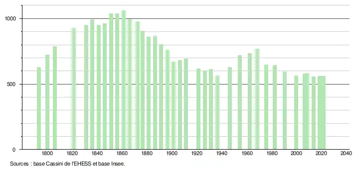 L'évolution du nombre d'habitants est connue à travers les recensements de la population effectués dans la commune depuis 1793. Pour les communes de moins de 10 000 habitants, une enquête de recensement portant sur toute la population est réalisée tous les cinq ans, les populations légales des années intermédiaires étant quant à elles estimées par interpolation ou extrapolation[15]. Pour la commune, le premier recensement exhaustif entrant dans le cadre du nouveau dispositif a été réalisé en 2008[16].