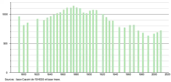 L'évolution du nombre d'habitants est connue à travers les recensements de la population effectués dans la commune depuis 1793. À partir du , les populations légales des communes sont publiées annuellement dans le cadre d'un recensement qui repose désormais sur une collecte d'information annuelle, concernant successivement tous les territoires communaux au cours d'une période de cinq ans. Pour les communes de moins de 10 000 habitants, une enquête de recensement portant sur toute la population est réalisée tous les cinq ans, les populations légales des années intermédiaires étant quant à elles estimées par interpolation ou extrapolation[19]. Pour la commune, le premier recensement exhaustif entrant dans le cadre du nouveau dispositif a été réalisé en 2004[20],[Note 1].