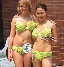 L'association People for the Ethical Treatment of Animals crée des bikinis de laitue pour faire la publicité du végétarisme. Plusieurs stars les portent, dont Pamela Anderson, Elizabeth Berkley, Jayde Nicole et Courtney Stodden[67]. Au contraire, Lady Gaga porte un bikini de viande (différente de sa robe de viande) sur la couverture de Vogue[68],[69], un acte très critiqué par PETA[70]. L'écologie est aussi au cœur de l'utilisation de certains matériaux comme du coton bio, des fibres de bambou, des chutes de tissu, des bouteilles de soda reconditionnées, des filets de pêches, du nylon recyclé ou du soja[71],[72],[73],[74]. L'inventeuse Claudia Escobar crée des bikinis écologiques en peau de saumon tannée et teinte en 2003[75].