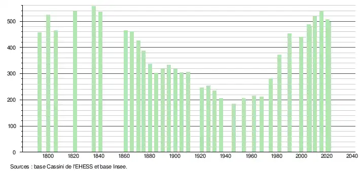 L'évolution du nombre d'habitants est connue à travers les recensements de la population effectués dans la commune depuis 1793. Pour les communes de moins de 10 000 habitants, une enquête de recensement portant sur toute la population est réalisée tous les cinq ans, les populations légales des années intermédiaires étant quant à elles estimées par interpolation ou extrapolation[27]. Pour la commune, le premier recensement exhaustif entrant dans le cadre du nouveau dispositif a été réalisé en 2005[28].