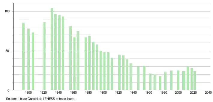 L'évolution du nombre d'habitants est connue à travers les recensements de la population effectués dans la commune depuis 1793. Pour les communes de moins de 10 000 habitants, une enquête de recensement portant sur toute la population est réalisée tous les cinq ans, les populations légales des années intermédiaires étant quant à elles estimées par interpolation ou extrapolation[19]. Pour la commune, le premier recensement exhaustif entrant dans le cadre du nouveau dispositif a été réalisé en 2007[20].