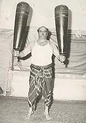 Pahlavan Mustafa Toosi portant une paire de Mīl (masses).