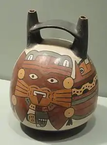 Le Vase à double bec et pont est une forme de récipient à boire généralement en céramique qui s'est développé un peu avant 500 av. J.-C. par des groupes indigènes de la côte péruvienne[1]. Fidèle à son nom, ce type de bouteille se distingue par deux becs reliés par une poignée. D'abord utilisé par la culture Paracas, il a ensuite été adopté par les Nazca. Alors qu'au début les Paracas avaient tendance à inciser des dessins dérivés de l'art de la culture Chavin sur la surface des vases[2], plus tard ils ont commencé à les traiter comme des formes sculptées, c'est une avancée facilitée par les développements de la technologie céramique qui a permis de construire des récipients aux parois plus minces[3]. Cette tradition a été poursuivie par les Nazca, dont les récipients étaient minutieusement figuratifs (voir illustration ci-dessous à droite), décorés de glaçures polychromes.