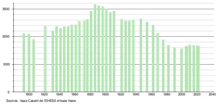 L'évolution du nombre d'habitants est connue à travers les recensements de la population effectués dans la commune depuis 1793. Pour les communes de moins de 10 000 habitants, une enquête de recensement portant sur toute la population est réalisée tous les cinq ans, les populations légales des années intermédiaires étant quant à elles estimées par interpolation ou extrapolation[36]. Pour la commune, le premier recensement exhaustif entrant dans le cadre du nouveau dispositif a été réalisé en 2005[37].