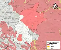 Les mouvements de terrains susceptibles de se produire sur la commune sont des tassements différentiels[17]. Le retrait-gonflement des sols argileux est susceptible d'engendrer des dommages importants aux bâtiments en cas d’alternance de périodes de sécheresse et de pluie[18]. 60,3 % de la superficie communale est en aléa moyen ou fort (54,9 % au niveau départemental et 48,5 % au niveau national)[Carte 2]. Depuis le , en application de la loi ELAN, différentes contraintes s'imposent aux vendeurs, maîtres d'ouvrages ou constructeurs de biens situés dans une zone classée en aléa moyen ou fort[Note 2],[19].