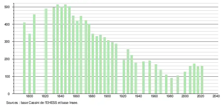 L'évolution du nombre d'habitants est connue à travers les recensements de la population effectués dans la commune depuis 1793. Pour les communes de moins de 10 000 habitants, une enquête de recensement portant sur toute la population est réalisée tous les cinq ans, les populations légales des années intermédiaires étant quant à elles estimées par interpolation ou extrapolation[23]. Pour la commune, le premier recensement exhaustif entrant dans le cadre du nouveau dispositif a été réalisé en 2006[24].