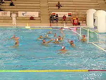 L'équipe du VA Cattaro en défense (bonnet rouge) contre le Montpellier Water-Polo (bonnet blanc) lors du premier tour du trophée LEN 2009-2010. Sur le banc, les deux entraîneurs du club : les frères Mirko et Željko Vičević.