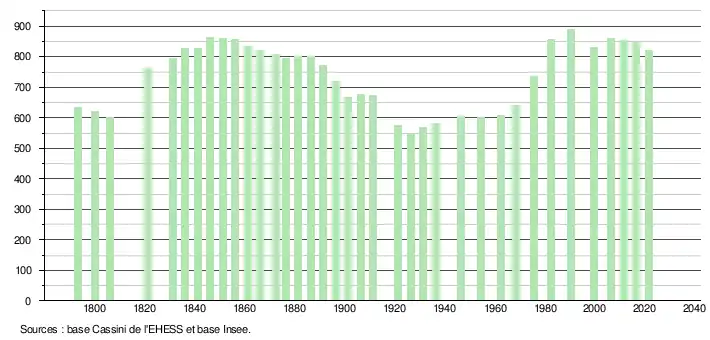 L'évolution du nombre d'habitants est connue à travers les recensements de la population effectués dans la commune depuis 1793. Pour les communes de moins de 10 000 habitants, une enquête de recensement portant sur toute la population est réalisée tous les cinq ans, les populations légales des années intermédiaires étant quant à elles estimées par interpolation ou extrapolation[23]. Pour la commune, le premier recensement exhaustif entrant dans le cadre du nouveau dispositif a été réalisé en 2006[24].
